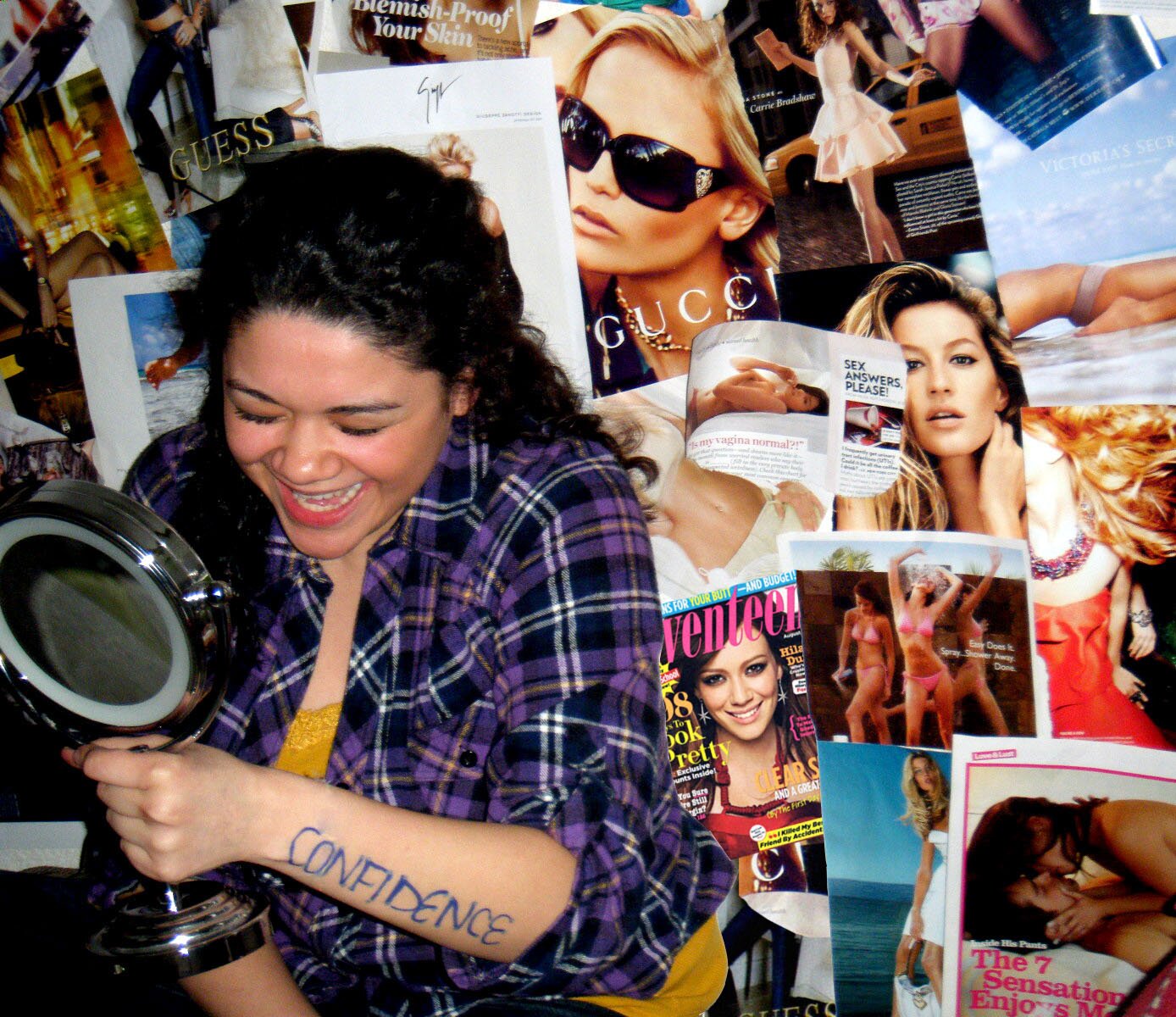 I think the media affects our health confidence a lot, and I think it usually brings it down, it brings our self-esteem down. So I wanted to show how even though there are all these beautiful Photoshopped women everywhere — and we’re supposed to want to look like them — there’s a young woman who sees all those images in the mirror and she’s smiling in front of them, because she likes what she’s seeing in herself.